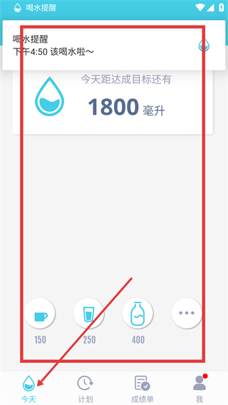 1、在今天界面查看喝水提醒和剩余目标水量,选择不同容量的水杯记录喝水量,逐步达成每日喝水目标。