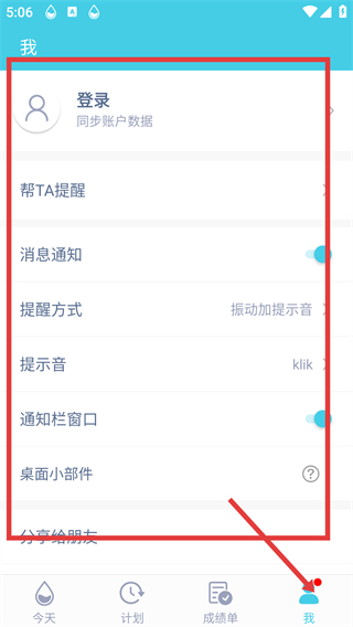 4、进入我界面进行登录、设置提醒方式和提示音等操作,个性化定制喝水提醒的各项设置,提升使用的便利性。