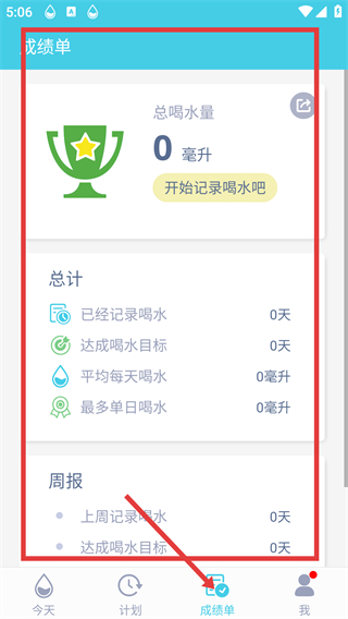 3、在成绩单界面查看总喝水量、达成目标天数等数据,了解自己的喝水情况,激励自己坚持达成喝水目标。